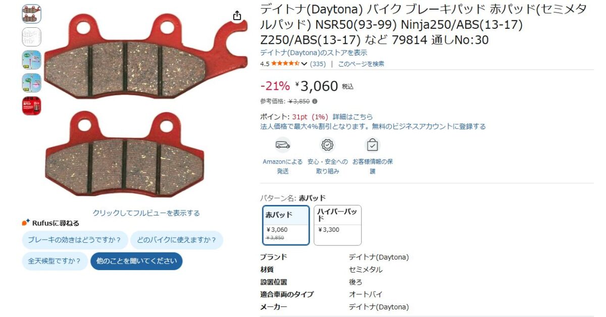 デイトナ(Daytona) バイク ブレーキパッド 赤パッド(セミメタルパッド) NSR50(93-99) Ninja250(13-17) Z250(13-17) など 79814