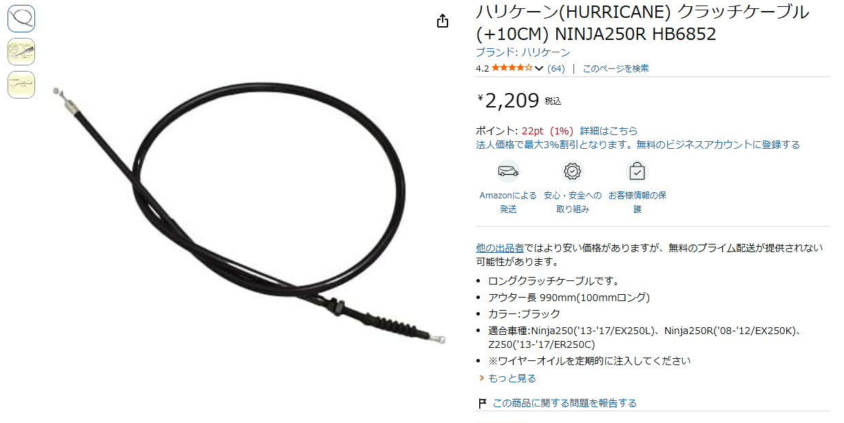 ハリケーン(HURRICANE) クラッチケーブル (+10CM) NINJA250R